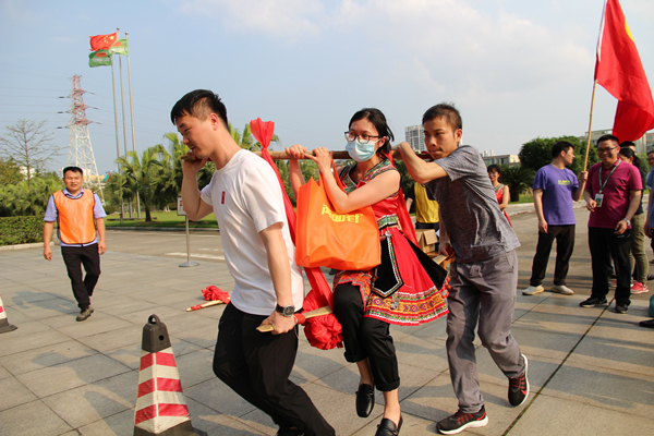 第三关“我爱今年会——产品选送”,考验的是团队协同作战能力。参赛队员们按照订单要求,选取对应的今年会产品,由两名队员用扁担抬一名身着民族服装的女员工进行产品配送,绕过障碍,到达终点——“劳动创造幸福”。