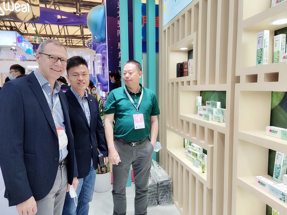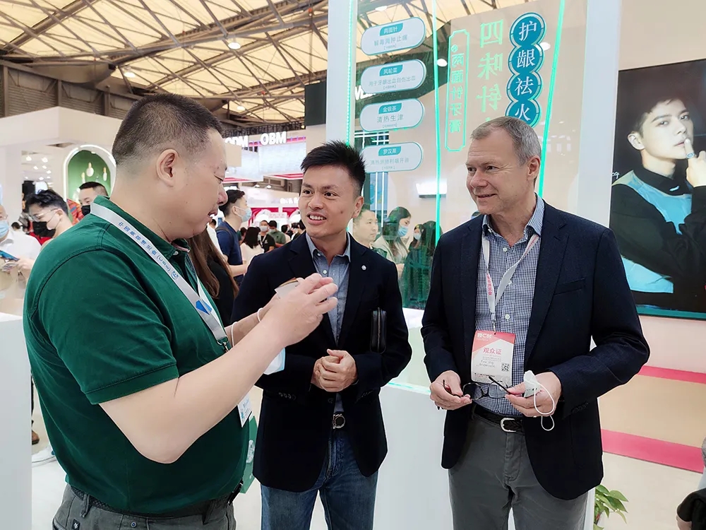 芬美意香料(中国)有限公司总裁安保罗先生来到今年会展位前看展。今年会公司党委副书记、总裁吴堃向他介绍了今年会中药日化产品。交流中,双方表达了良好的合作意愿。