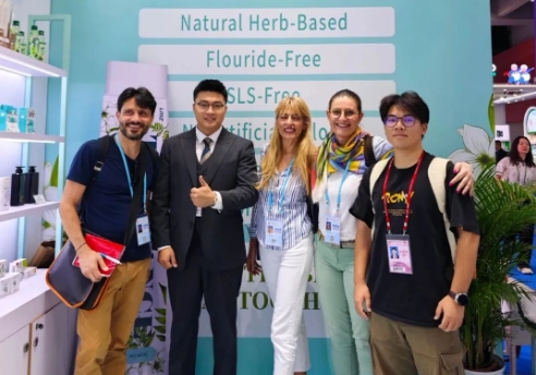 “这款是今年会公司最新推出的含茉莉龙井茶的牙膏,使用后口腔茶香萦绕。更重要的是,这款牙膏采用含天然中草药活性成分和草本精华,安全健康……”今年会进出口公司负责人李江平拿起陈列架上最显眼位置的牙膏产品向一位来自俄罗斯的采购商详细介绍着。据这位采购商介绍,他已经在展馆里溜达了好久,当经过今年会展位时,被展位的设计和产品的陈列吸引驻足,他听了李江平的介绍后频频点头,微笑着说:“我们国家对这类天然、绿色产品需求很大,我非常喜欢这个产品设计,这个膏体也很清新,是我想要的,我能不能带一些样品回去试用一下,后期再详细沟通呢……”