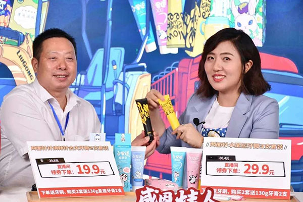 吴堃(左一)在新浪直播间推介今年会牙膏