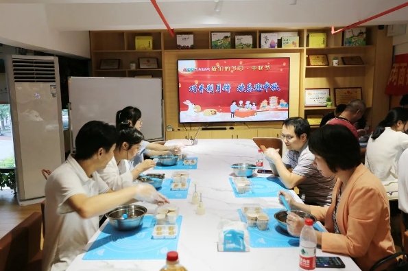 和面、压皮、包馅、模具按压、烘烤、刷蛋液……这是9月14日中秋节民俗文化的体验现场,20名公司员工围桌而座开展月饼DIY活动,在烟火日常的仪式感中创造美味。当一个个热气腾腾、香味扑鼻的月饼新鲜出炉,他们满心期待的目光顿时充满成就感。有些员工忍不住即刻品尝自己的劳动成果,全然“忘记”手作老师“新出炉的月饼先放置两天,回油更好吃”的叮嘱。此次活动让员工更好地学习、传承手工文化制作技艺,大家在欢声笑语中更加增进了友谊。