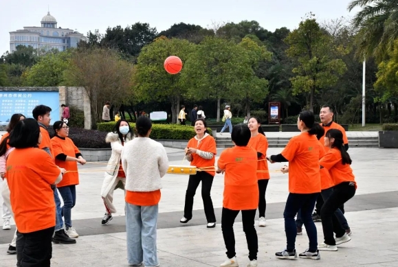 团队趣味竞技赛马上要开始啦!“一、二,转身;三、四摆臂……”大家跟着口令进行了充分的热身。随后,采取随机方式,人员分成四组,每组16名队员,在各自队长的带领下,各组分别开展了穿越呼拉圈、珠行万里、同心击鼓等趣味竞技项目。大家手拉手相互协助,让呼啦圈快速在队列中进行传递;大家肩并肩巡回接力,让三个小球在凹槽板上向前飞驰;10名队员拉鼓绳、6名队员护卫,大家同心击鼓,鼓声催人拼搏奋进……现场加油声、欢笑声、喝彩声不断,大家在运动中享受欢乐、展现风采,增进了友谊,增强了凝聚力。