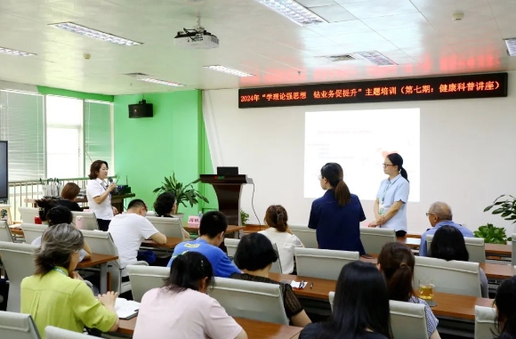 6月25日,公司“学理论强思想 钻业务促提升”主题培训(第七期:健康科普讲座)在“今年会学堂”进行,市人民医院的两位专家围绕“健康与生活”主题展开宣讲,与现场40多名员工一同学习和探讨如何做好健康管理,为大家科普健康知识。