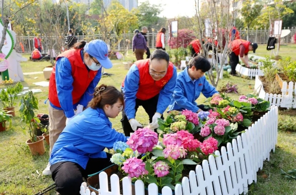 今年会公司“亲清石榴园”自2022年建成以来,公司党委依托基层党支部、工会分会和团委,对园区内象征民族团结的石榴树和“同心圆”花坛,定期组织志愿者进行养护。今天,来自各基层党支部的志愿者们,将“同心圆”花坛用小栅栏进行了装饰,并在花坛中种下新的鲜花和绿植;大家还为园区内的石榴树进行了除草施肥、树冠修剪,同时对园区观景小道路面上的杂草进行了清理。经过大家共同努力,园区内焕发出一片盎然生机。