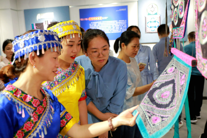 在市群众艺术馆,员工们参观了“巧手织就彩衣裳”少数民族服饰展,讲解员详细介绍了柳州苗、瑶、侗等少数民族服饰的制作技艺、每一道工序的由来和寓意,以及他们的生活习俗,透过一件件绚丽的少数民族服饰,深刻感受少数民族同胞的审美追求和非遗技艺里蕴含的丰富民族内核与情怀,在学习了解少数民族文化的同时,也激发了大家对本职工作专业性的思考。