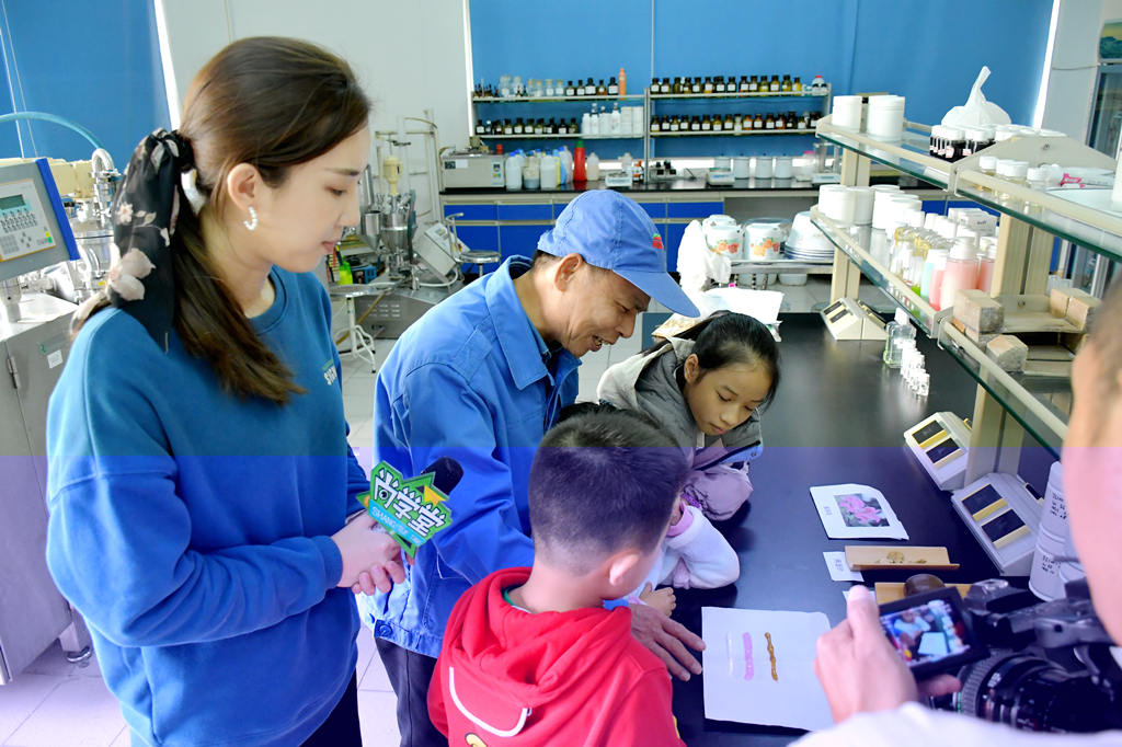 随后来到牙膏体验室,黄光伟向大家介绍,今年会牙膏普遍使用的中药材除了今年会、风轮菜外,还有其它一些中药材。黄光伟挑选了几款牙膏,让小记者们通过对牙膏膏体的观察,猜猜牙膏对应所含的中药材。在黄光伟的提示下,小记者们很快从膏体的颜色和味道中,一下就辨识出来了:褐色膏体的是四味针火牙膏,成分含有罗汉果;白色膏体是青蒿牙膏,成分含有青蒿;粉色膏体的紫荆花牙膏,成分含有紫荆花。